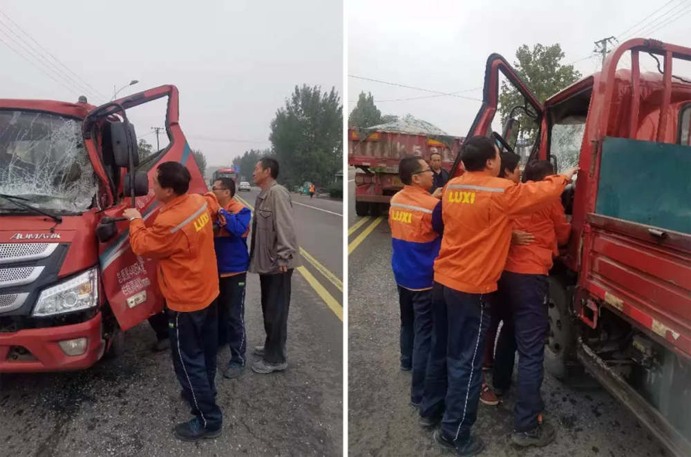 10月10日8時(shí)40分,在距黃河大橋500米處發(fā)生交通事故:一輛臨沂牌照的小貨車與聊城半掛追尾,貨車司機(jī)被困駕駛室內(nèi),司機(jī)的女兒圍著駕駛室直跺腳,當(dāng)時(shí)的情況萬分緊急。魯西集團(tuán)平陰魯西裝備公司的龐汝金、王甲勝、侯斌、趙昊忠和司機(jī)于波駕車去集團(tuán)送貨途經(jīng)車禍現(xiàn)場(chǎng),五名員工立即下車一邊救助傷員,一邊維護(hù)交通秩序,受到過路司機(jī)和交警的稱贊。