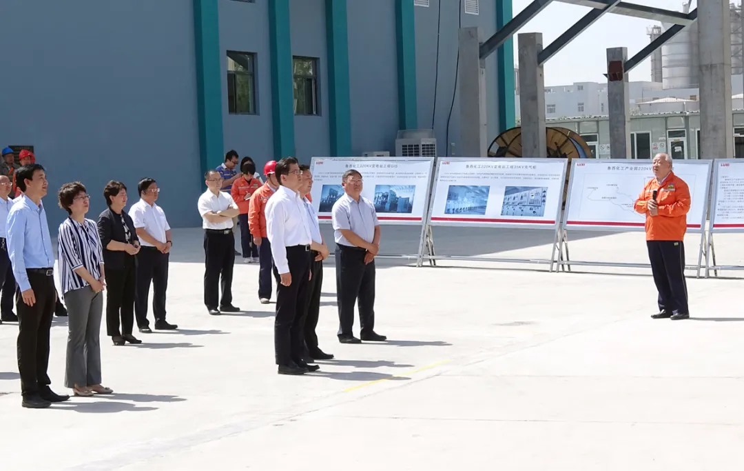 在魯西集團輸變電工程項目建設現場,聽取了集團黨委書記、董事長張金成關于輸變電工程項目建設情況、集團去年的運營指標、今年1-5月份的生產運營情況、重點任務的完成情況以及與中化的合作情況匯報。