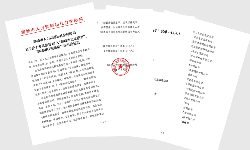 魯西集團陳娟、牟龍靜、唐文棟、李保路、衣后領、宋風庫、高慧蘭、王芳、鐘飛、王琳琳、亢肖彥、楊本宏、劉立振等13人因在第十一屆山東省化工行業職業技能大賽上取得優異成績,于6月上旬被聊城市人力資源和社會保障局授予“聊城市技術能手”稱號。